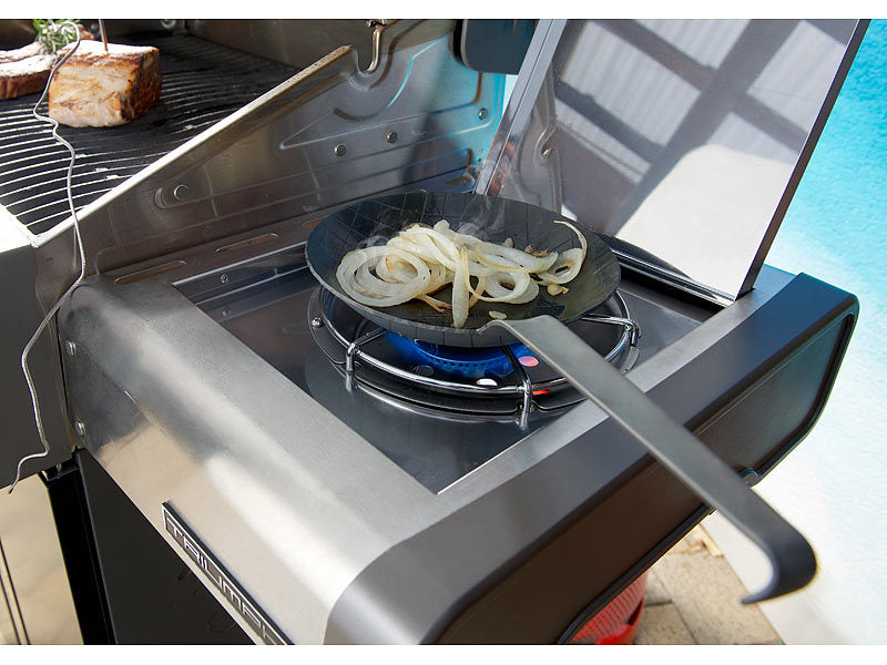 ה מחבת Smokey Hill אידיאלית לטיגון בזמן קמפינג. זה מושלם ב אש פתוחה. לאחר זמן מה, מחבתות העשויות מ יריעת ברזל מתכהות. מכיוון שיש לו ארוך ידית , ניתן בקלות ניתן לתלות אותו ולשמור אותו ב תיק המגן הכלול בהיקף המשלוח.